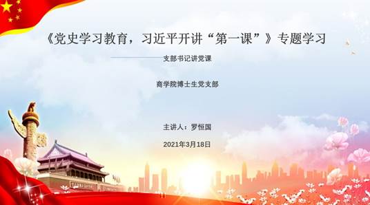 2021年3月18日晚上21:00,伟德客户端博士生黨支部書記羅恒國通過騰訊會議線上為黨支部成員講授黨課《黨史教育,習近平開講“第一課”》的專題學習。